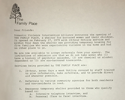 The first shelter for battered women and children in Texas: 50 families, including 91 children, found shelter, safety and healing that year.